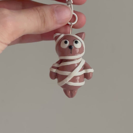 Chocolate Kitty figurine dressed as Mummy for Halloween! Hand sculpted using Polymer Clay. Comes with a metal clasp to be used as bag charm or keychain!