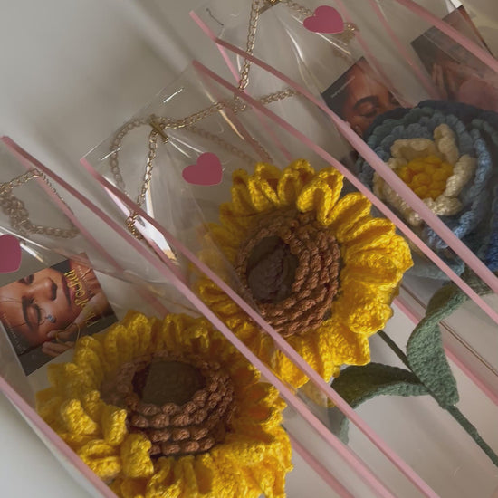A big crochet Sunflower handmade using yarn. These flowers come with a special wired structure so every petal, leave and the stem are flexible to be reshaped/adjusted according to your arrangement.