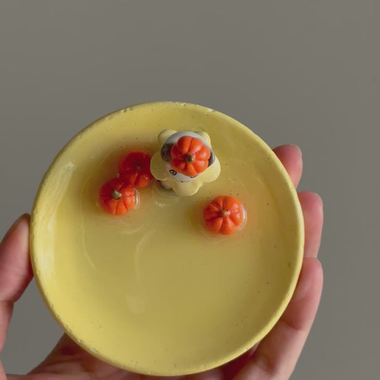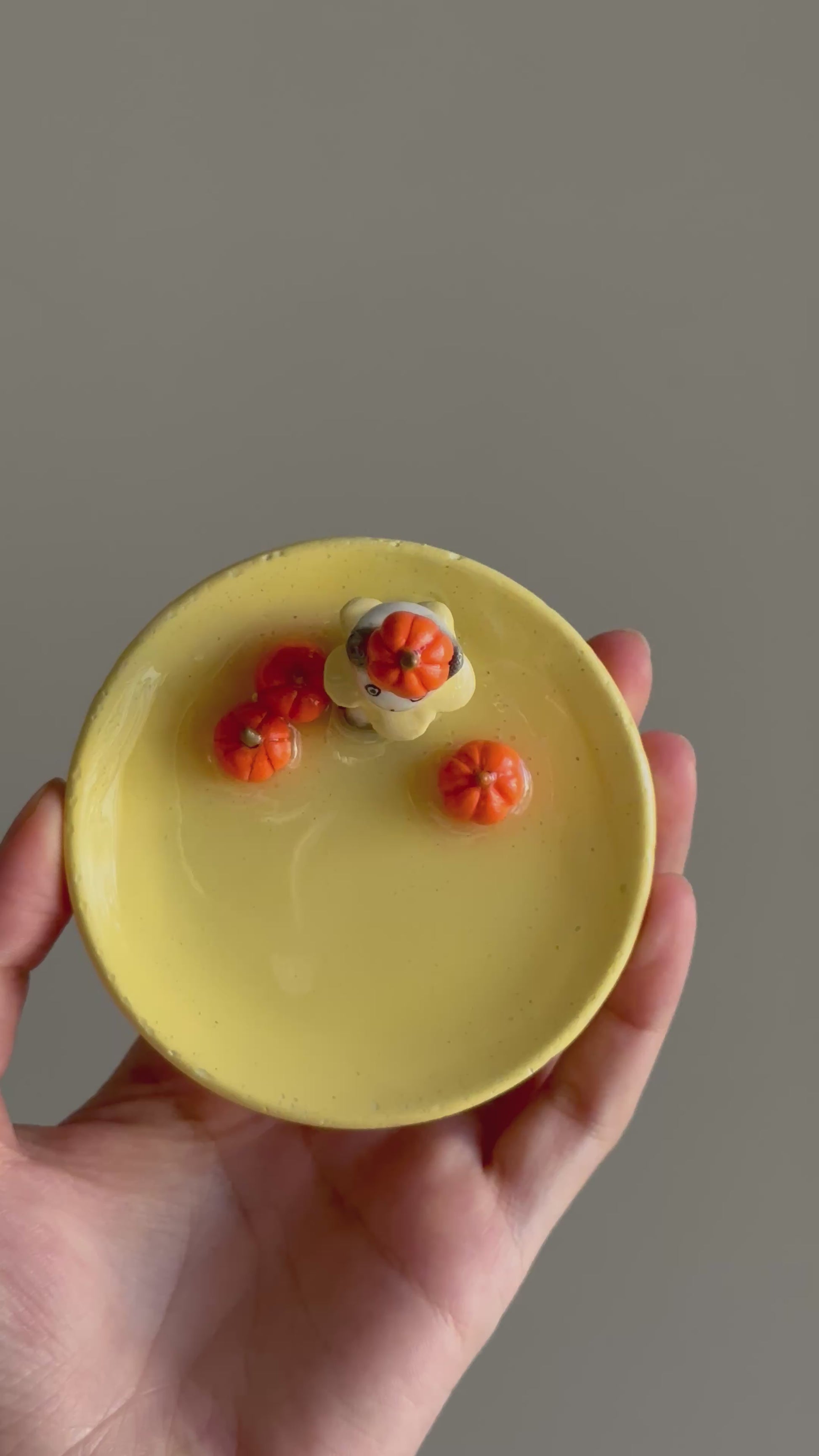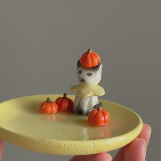Cute round trinket dish featuring a miniature cat with a flower collar sitting in a patch of miniature pumpkins. Hand sculpted using polymer clay.