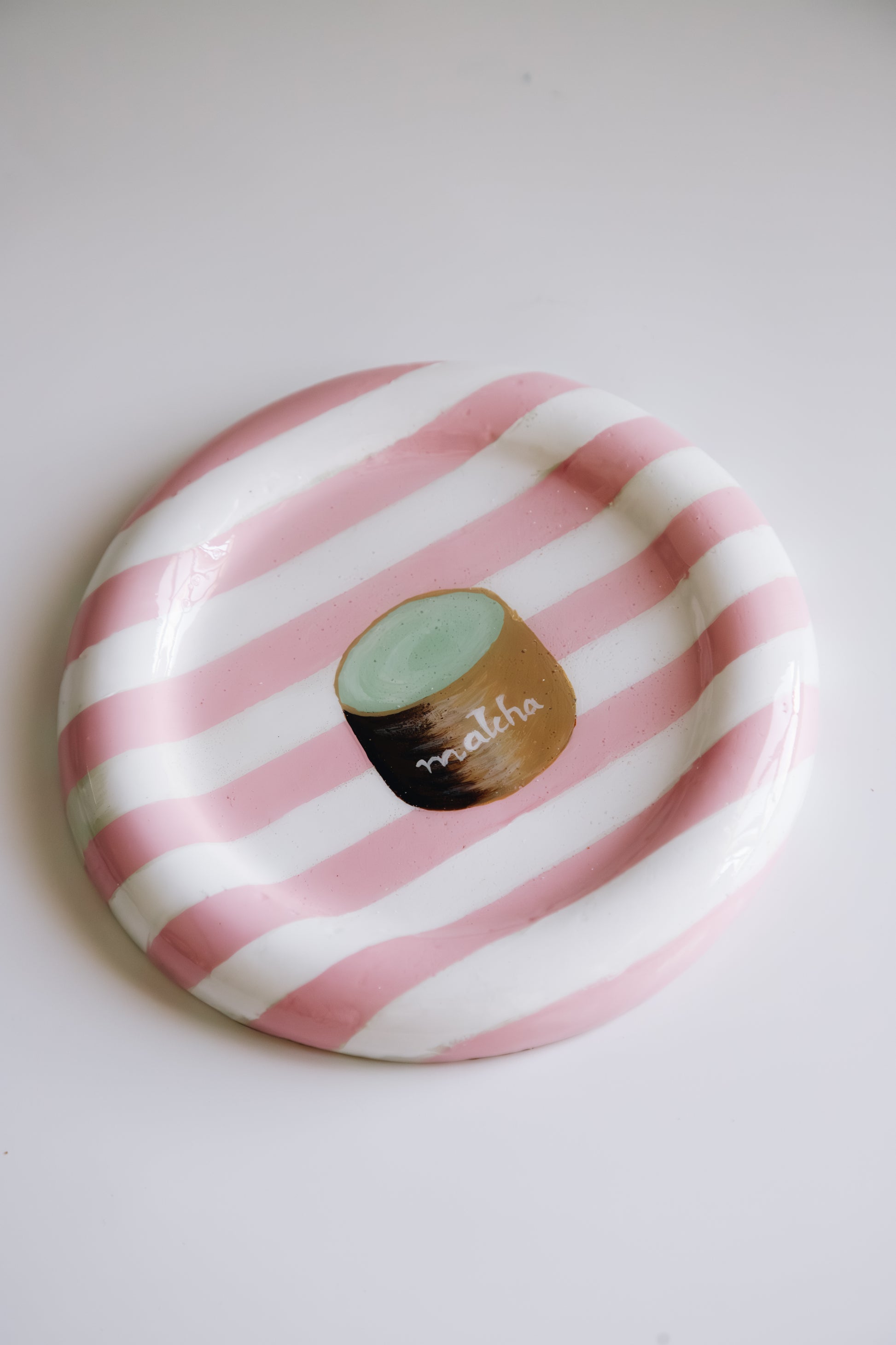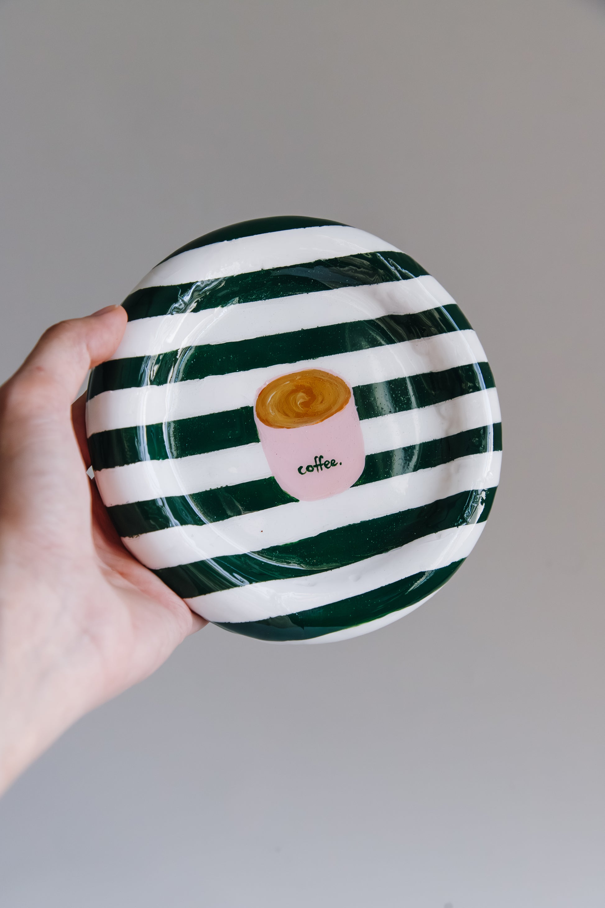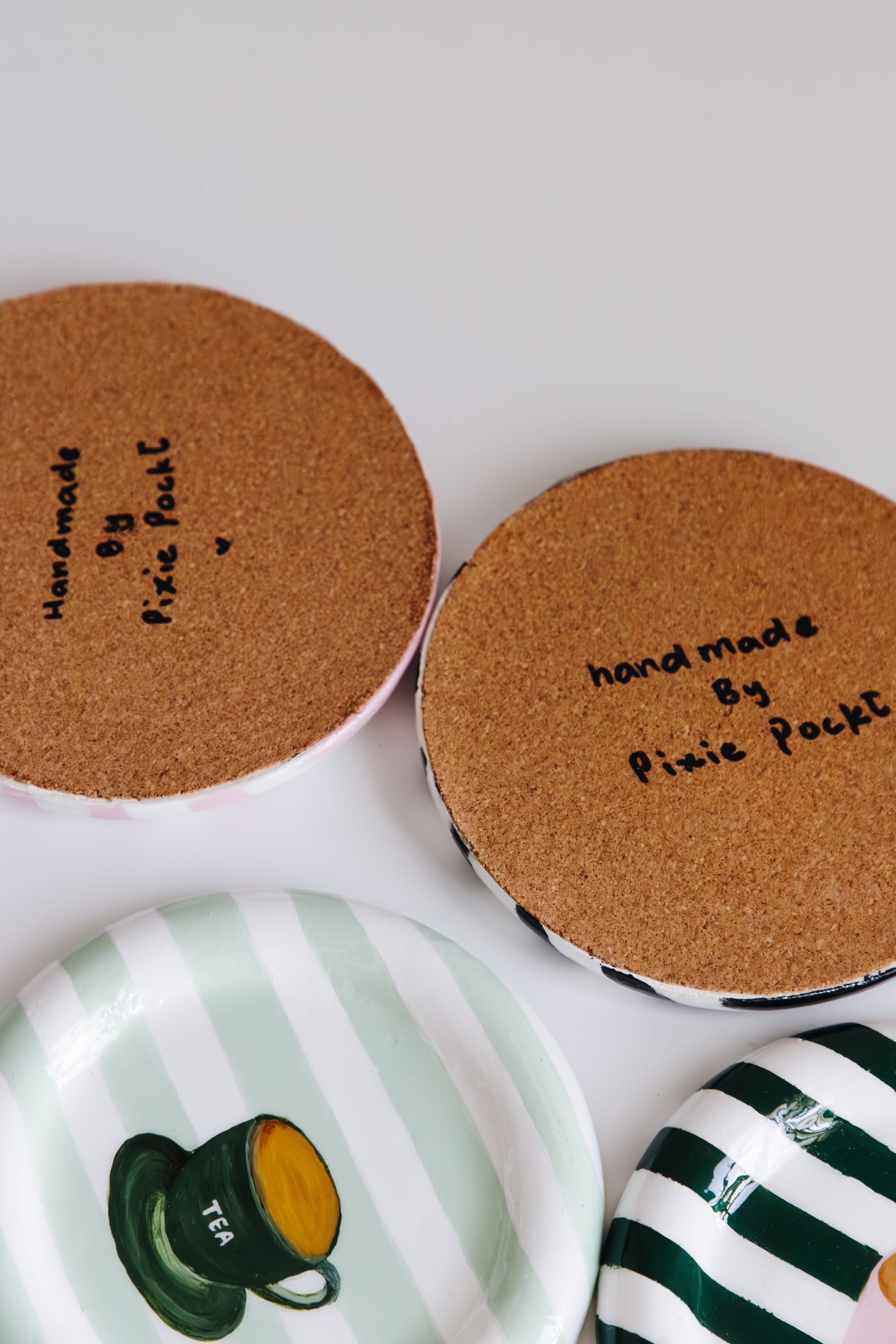A cute handmade & hand painted coaster featuring stripes and a beverage of your choice. Glazed using UV Resin to give it a glossy finish.