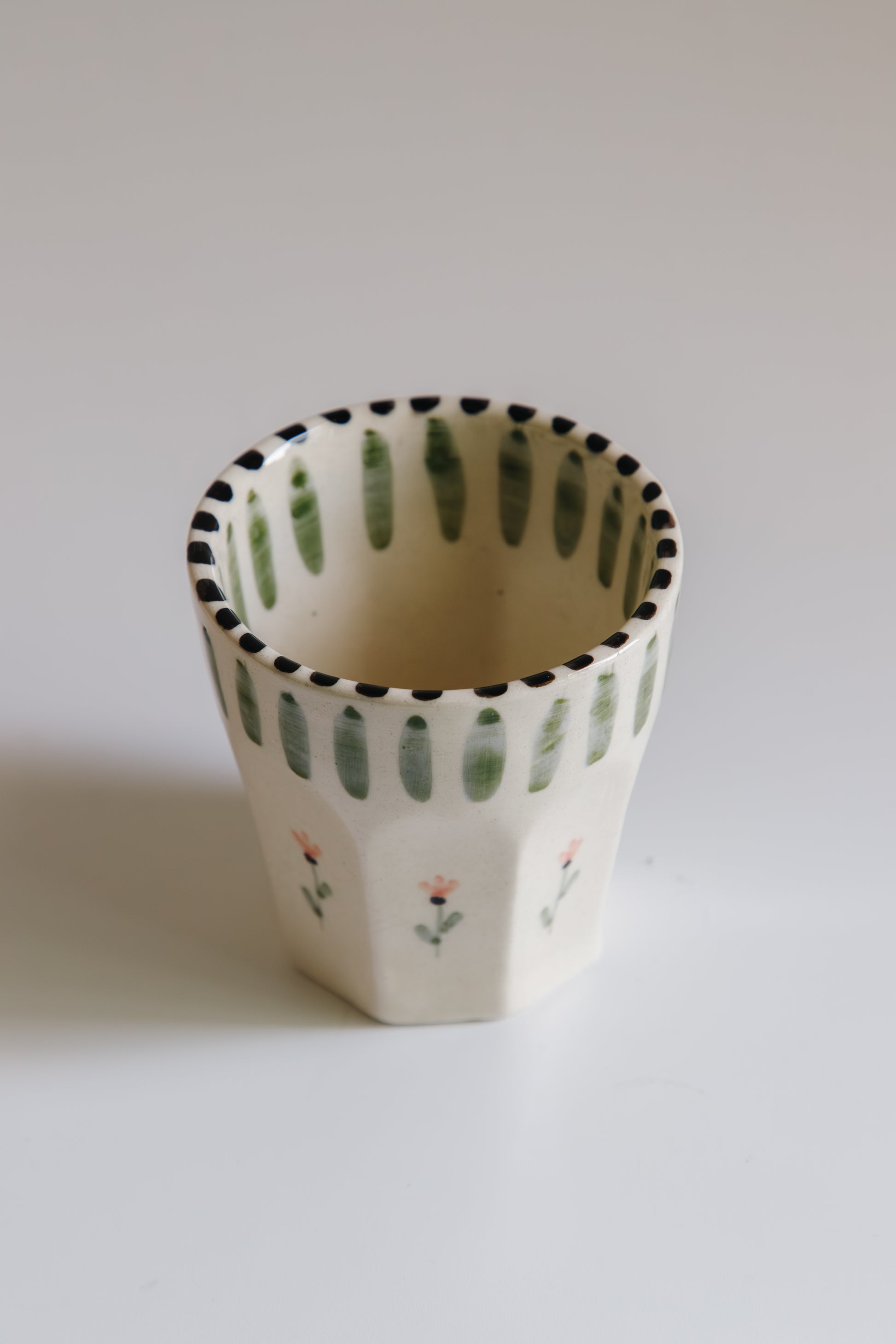 A cute handmade ceramic cup featuring hand-painted tulip flower motif and stripes. Each cup is hand made and features slight variations which is the true asset of any craft done by hand. Slow made in small batches.